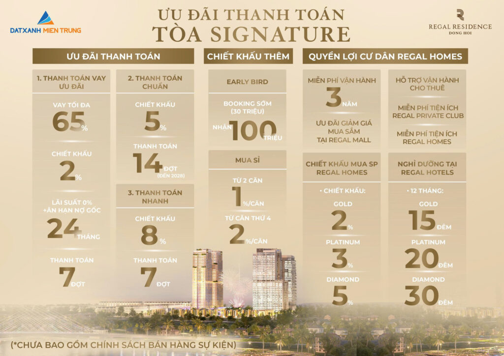Trong bức tranh đô thị biển đang vươn mình mạnh mẽ, Regal Residence Signature tỏa sáng như một biểu tượng mới của Regal Legend – nơi hội tụ tinh hoa sống thượng lưu và giá trị đầu tư bền vững. Hiện tại, chủ đầu tư đã chính thức công bố chính sách ưu đãi thanh toán mới nhất dành riêng cho tòa Signature, mang lại cơ hội hiếm có cho các nhà đầu tư và khách hàng muốn an cư lâu dài.